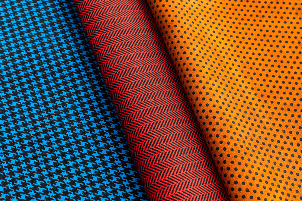 By transferring thermoplastic resin films through our rolling presses, we achieve a gloss effect with a wide variety of designs ranging from snake scales, geometric, dotted, floral and a variety of fantasy motifs. The fabric can be left as is or, through a subsequent process, be given an opaque appearance or decorated with metallic effects (foils) or colour designs (lacquers).